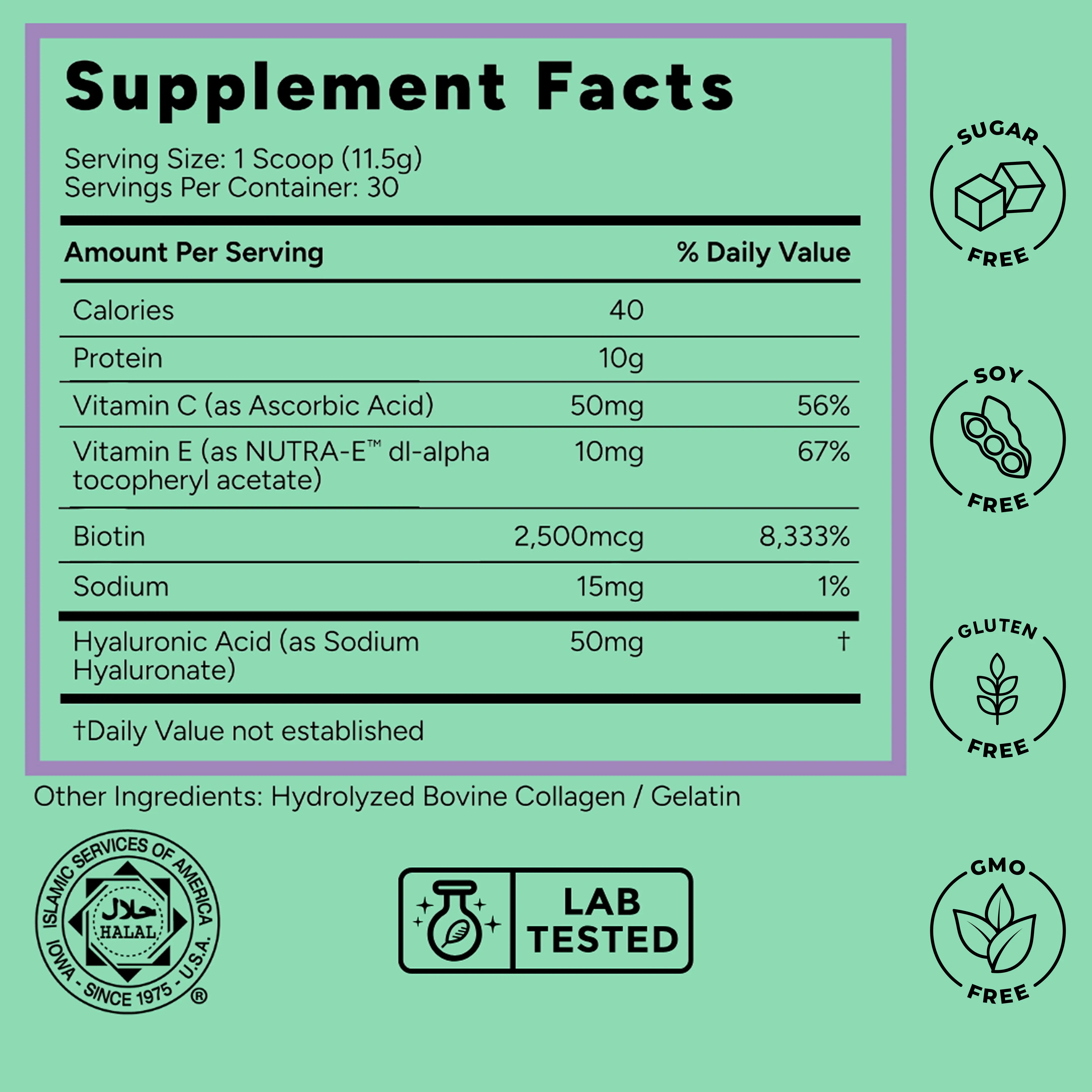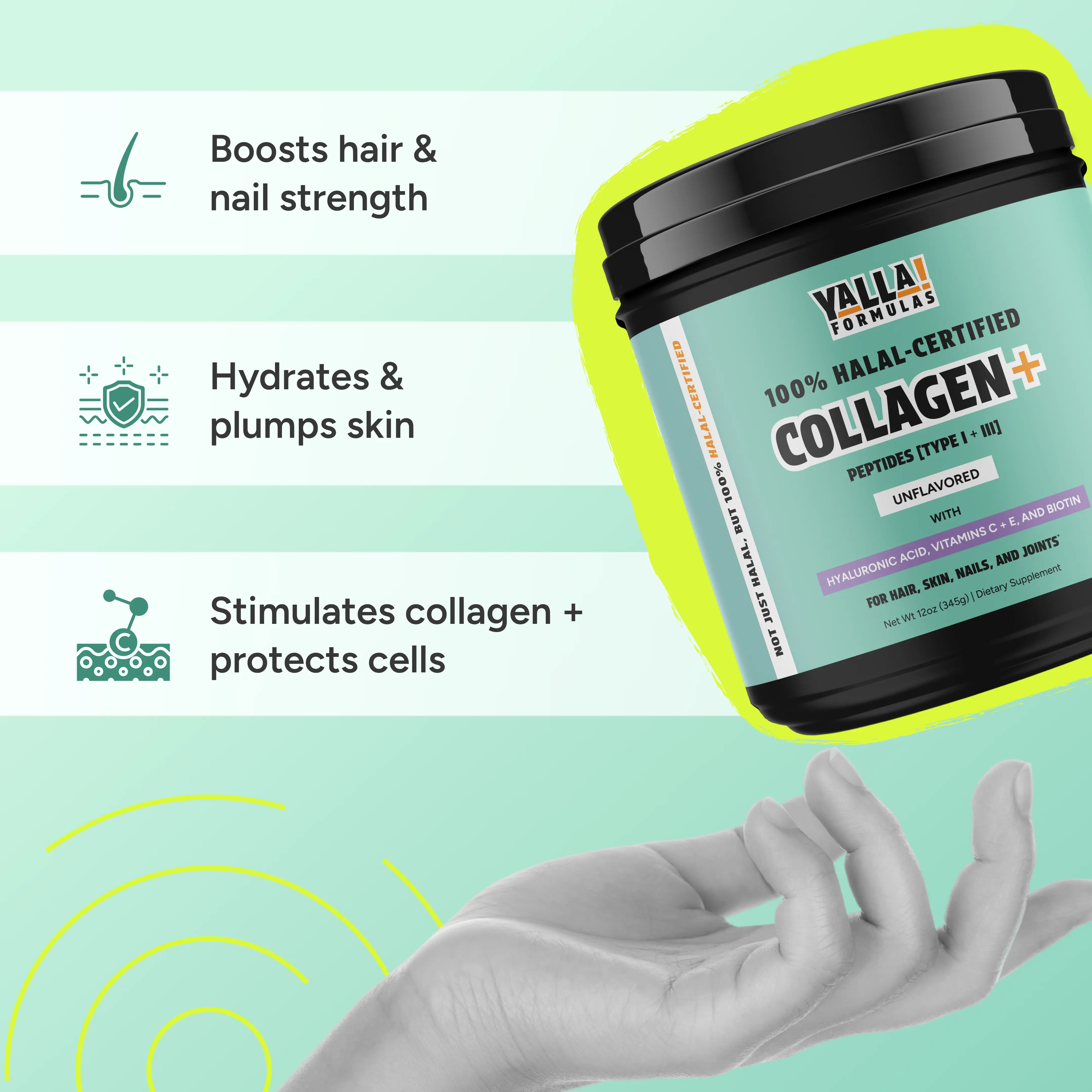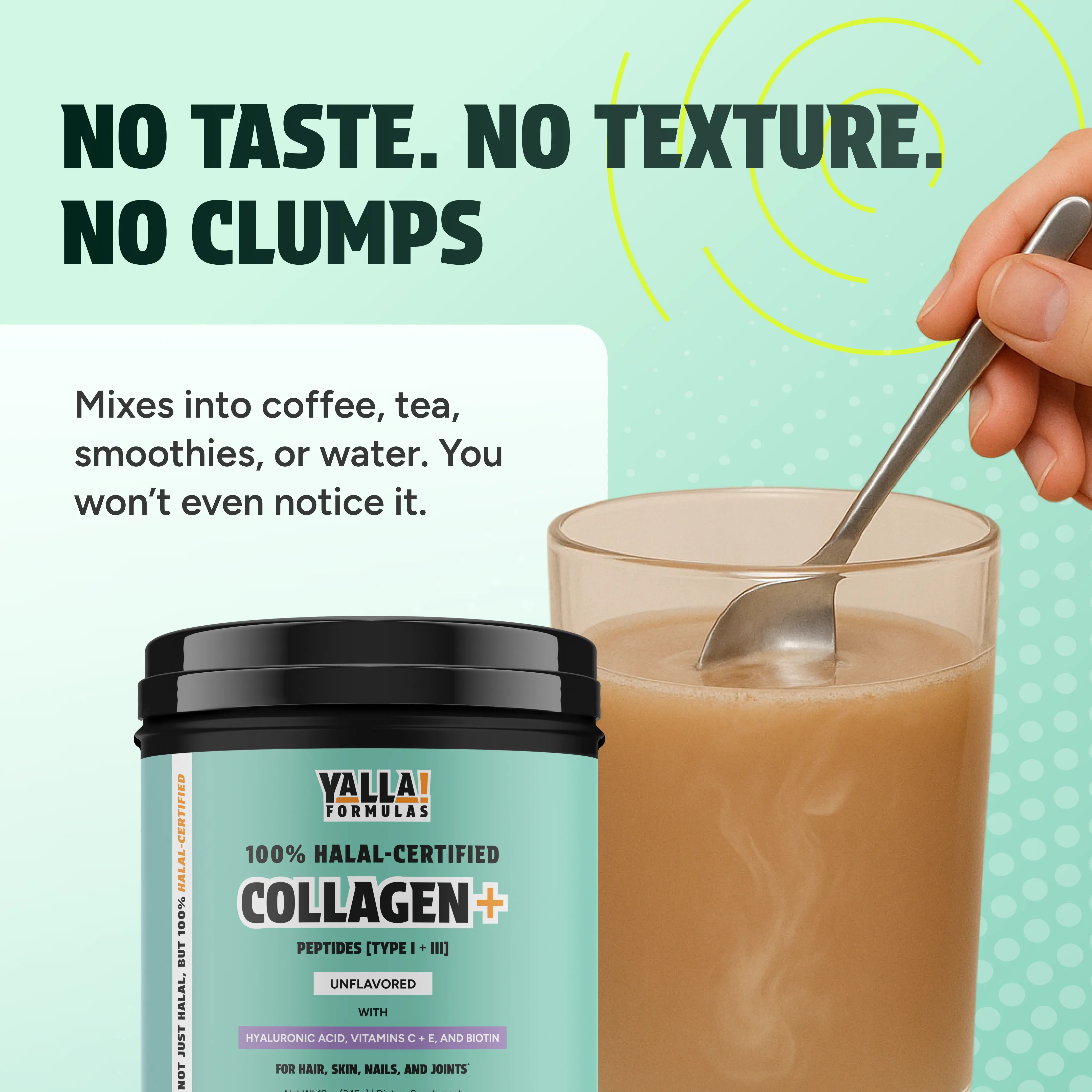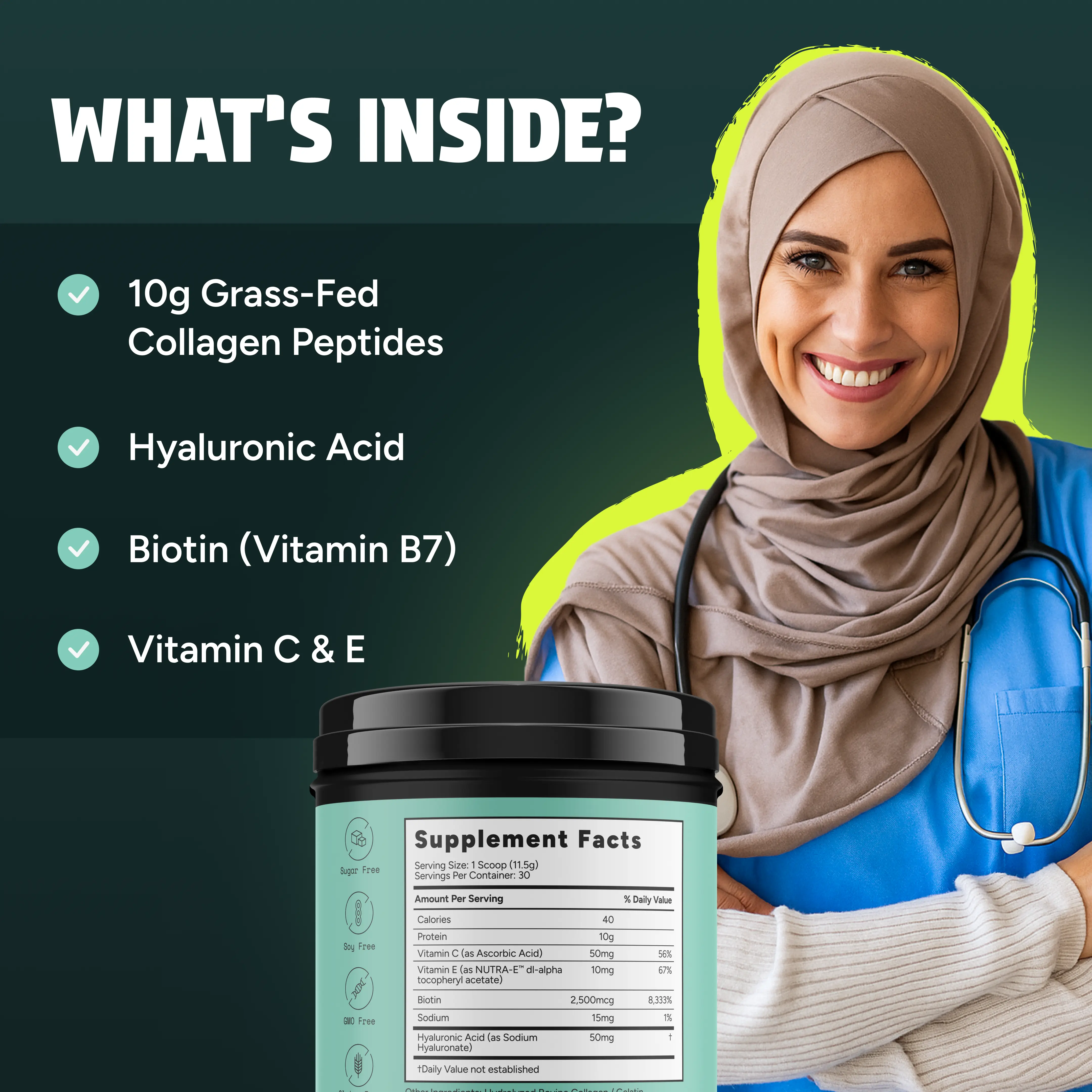 COLLAGEN+: YOUR ANTI-AGING WEAPON Every scoop floods your body with the exact building blocks it needs to rebuild youthful skin, hair, and joints. It's like pressing "rewind" on aging - but only the halal, ethical, scientifically-proven kind.