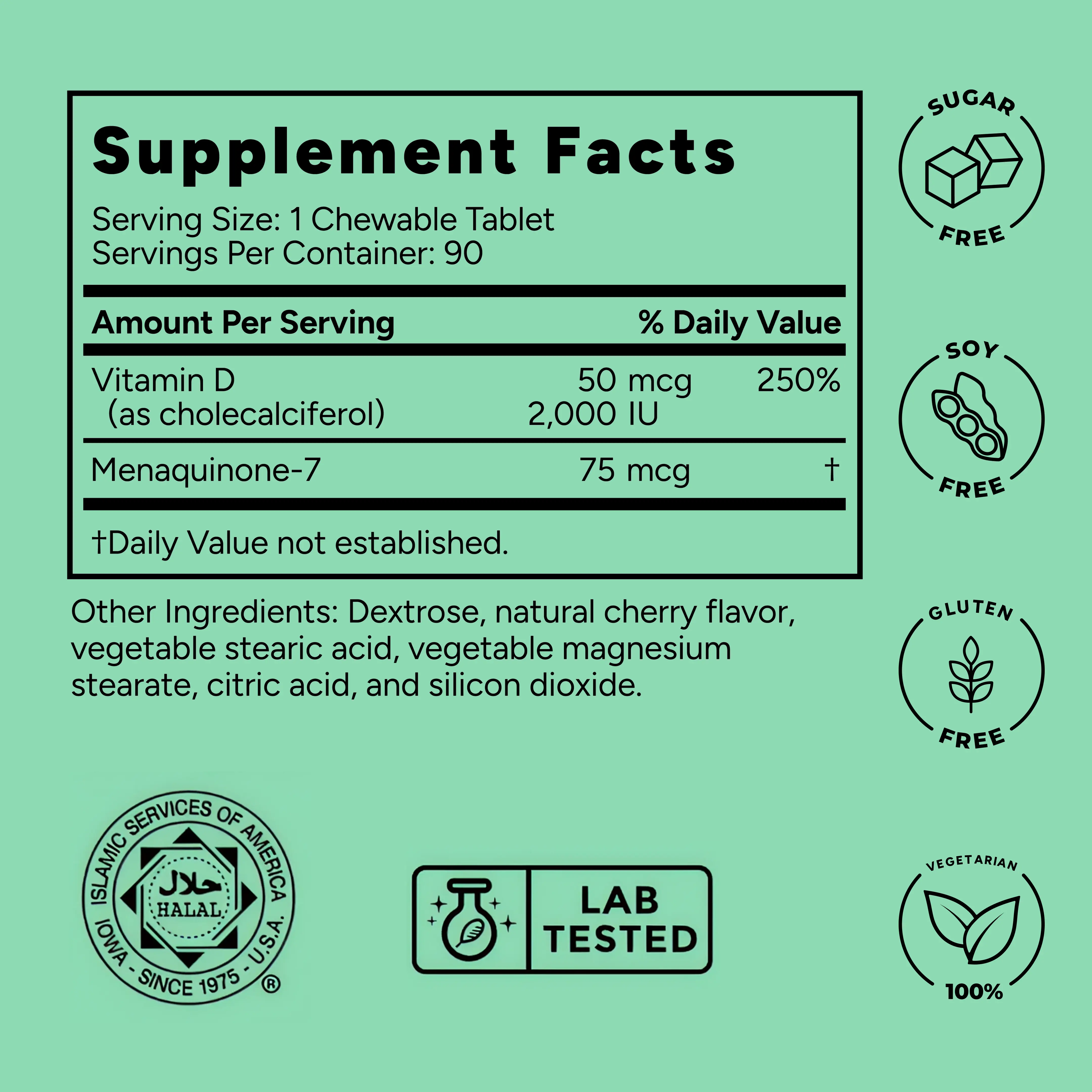 VITAMIN D3+K2: ACTUALLY TASTES GOOD Finally, a vitamin that doesn't make you grimace. Cherry-flavored and chewable. Kids love it. Adults actually look forward to it.