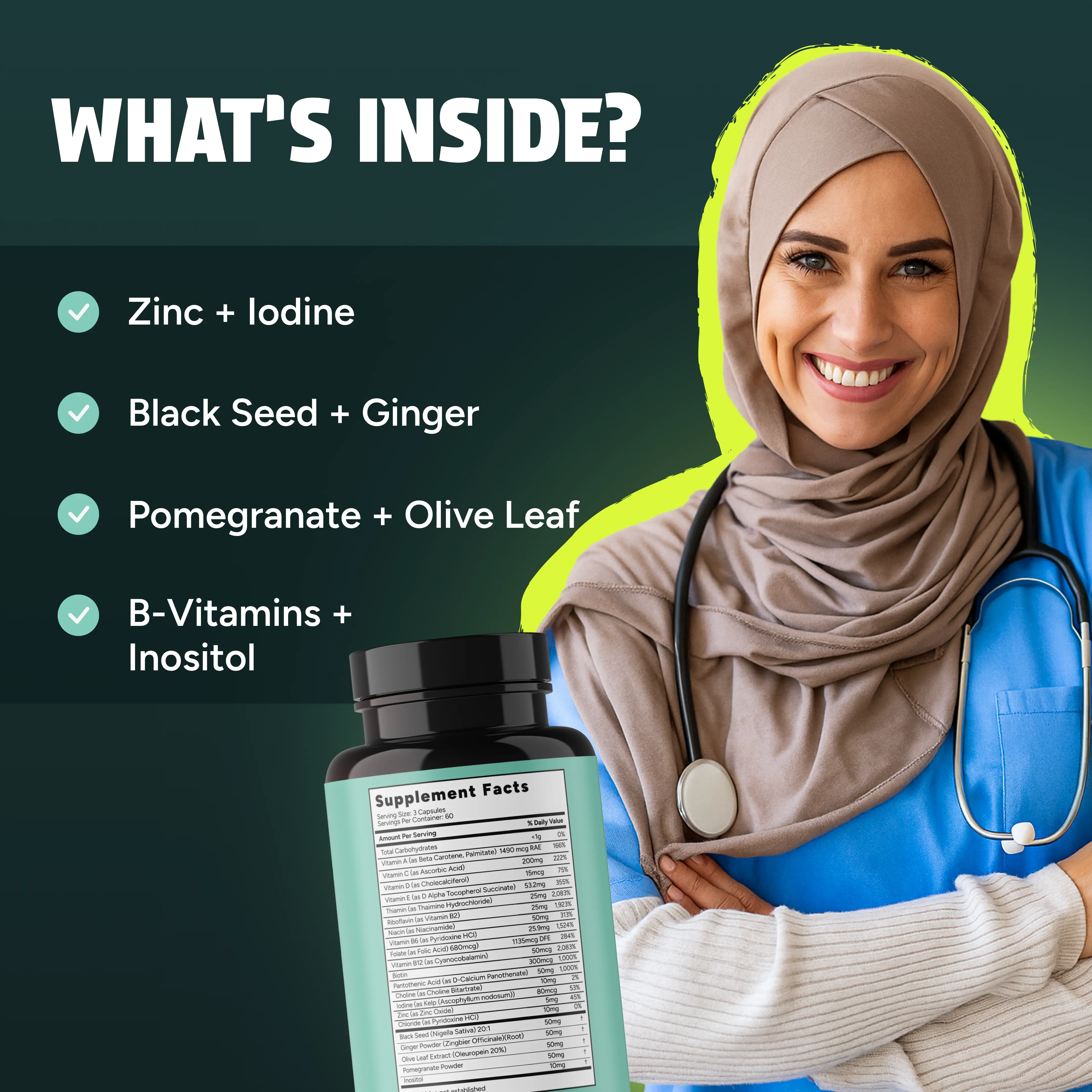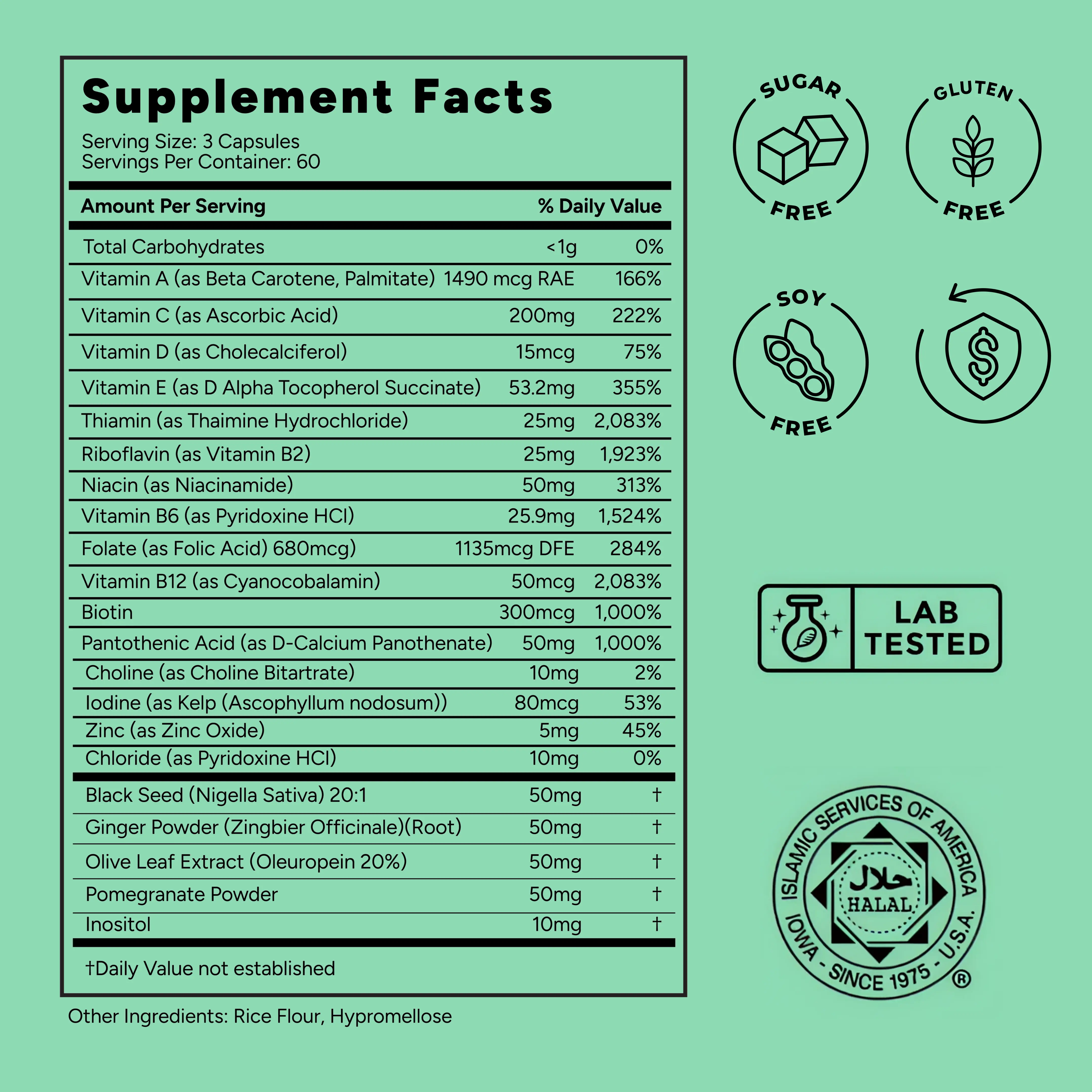 MULTIVITAMIN: YOUR DAILY INSURANCE POLICY This isn't just another multivitamin: it's total-body protection powered by ingredients blessed in the Qur'an. Black seed, olive leaf, pomegranate, ginger.